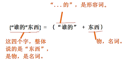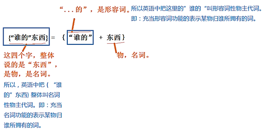 在{“谁的”物品}这个短语中,“谁的”为一种形容词性质的、表示某物归其主人所拥有的词,故而“谁的”简称“形容词性物主代词”。鉴于这种词具有形容词性质,它们后面必须加上形容词所修饰的“物品”,才能完成完整意思的表达。